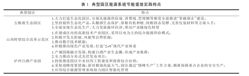 園區(qū)在推動我國實體經濟發(fā)展和城鎮(zhèn)化發(fā)展中發(fā)揮了關鍵作用,是支撐制造強國戰(zhàn)略的主戰(zhàn)場。有研究表明,園區(qū)二氧化碳排放量約占全國總排放量的31%[4],園區(qū)是資源能源消耗最集中的地方?,F(xiàn)階段,為了節(jié)約能源,保護環(huán)境,我國各級園區(qū)都在持續(xù)推動綠色低碳發(fā)展。田金平等研究指出我國工業(yè)園區(qū)節(jié)能提效實踐創(chuàng)新主要體現(xiàn)在以下5個方面: ①聚焦重點領域,全過程系統(tǒng)性推進節(jié)能工作。②集中式能源基礎設施升級改造,多樣化開發(fā)利用余熱、 余壓和能量多級利用。③積極利用可再生能源,推進能源結構轉型升級。④積極開展智慧能源探索,實現(xiàn)能源全過程精細化管理。⑤建立健全能源管理體系。表1為典型園區(qū)能源系統(tǒng)節(jié)能提效實踐特點。