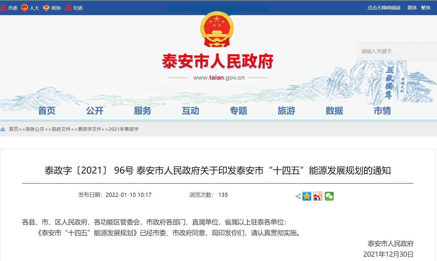 近日,山東省泰安市人民政府印發(fā)《泰安市“十四五”能源發(fā)展規(guī)劃》(以下簡(jiǎn)稱(chēng)《規(guī)劃》)。“十四五”期間,泰安市圍繞堅(jiān)持“創(chuàng)新驅(qū)動(dòng)、綠色低碳、效率優(yōu)先、多元互補(bǔ)、智能共享”的基本原則,加快構(gòu)建清潔低碳、安全高效的現(xiàn)代能源體系,深入推進(jìn)能源生產(chǎn)和消費(fèi)方式變革,進(jìn)一步促進(jìn)全市現(xiàn)代能源經(jīng)濟(jì)高質(zhì)量發(fā)展。