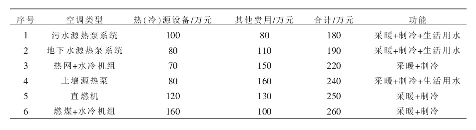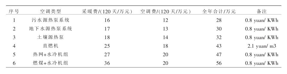 從上述表格可以明顯地看出來,污水源熱泵系統(tǒng)有良好的經濟效益,與地下水源熱泵、直燃機、熱網+水冷機組、燃煤+水冷機組等系統(tǒng)相比,該系統(tǒng)經濟優(yōu)勢十分明顯。